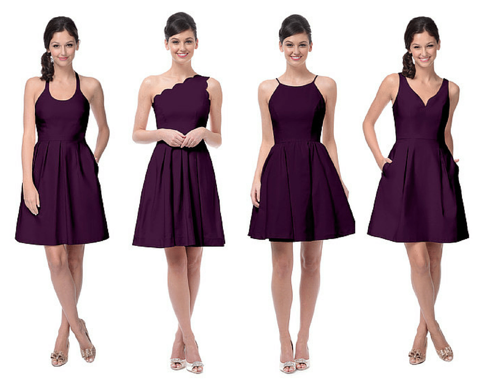 Don’t quite know how or where to start? We recommend starting with something that truly inspires you and growing the theme from there. For us, we fell in love with the rustic plum bouquet below, which served as the inspiration for our mix-and-match look. While we were tempted to toss in multiple colors (like a deep navy or girly blush), we decided to streamline color and length and make varying necklines the focus. If you attempt different necklines, lengths, fabrics and colors, it can get messy…fast. We’re picturing our styles — structured short frocks, each with its own neckline — accessorized with nude shoes, a luscious wrap and the plum bouquet below. Fall-time perfection, anyone? Enjoy.