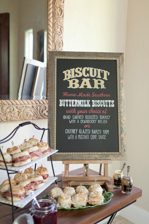 A biscuit bar is sure to indulge and comfort every lady at the event. From fried chicken to country ham, there’s a bit of southern spirit wrapped up in this idea.