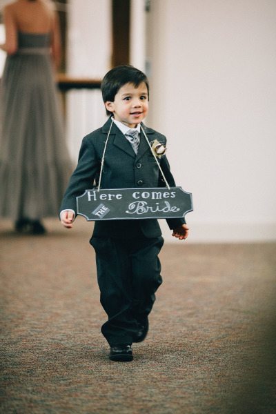 “Walk this way,” or “Here comes the Bride,” signs can go a long way with the guests and the photographer, so why not have an adorable little gal or guy have the responsibility of holding it?