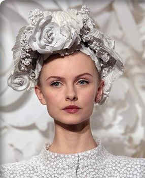 In the presentations from Oscar de la Renta the net seems to be really popular. With an extravagant look, the de la Renta bride is sufficiently daring as to dress her hairstyle and face in a veil under the format of a net. And due to the fact that the attitude matters, Priscilla of Boston proposes to the brides the daring of a cap made of white fur, with silver glitter.