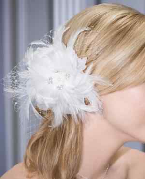 There’s another interesting bridal hair flower that we want to suggest to you and it makes you look extravagant: this one is made of multiple layers of fabric and with feather applications, as well as net details. There’s also the glittery detail in the middle that we want to mention about. It’s indeed a nice flower arrangement, which we consider that looks gorgeous indeed in combination with an extravagant wedding dress.
