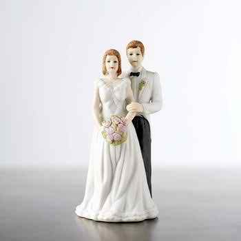 A funny image can be when the bride pinches the grooms` posterior! It will be certainly funny if you choose to place such a miniature on top of your wedding cake! Speaking of funny miniatures, another one can be a reunited couple trying to play soccer; the groom with a ball in his hand and the bride in his back! The movie “007” can be certainly a motif of inspiration! What can be funnier than a rough couple with guns in their hands, like “Mr. and Mrs. Smith”!