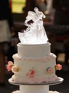 The next model presented offers you the opportunity of playing with your ideas! Create a fairy tale and place it on your wedding cake! You also can use the two figurines: husband and wife, on top of this cake! Also, you can use floral motifs that can be made from candy, in rose shape or even daisies! Use hearts, dots, straps and different shape you want! Also around every layer you can use a pearl necklace made also of sweet materials!