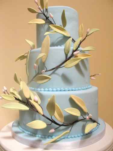 The next model we want to present you is made of three round layers and it’s in a sweet blue tone. The background is really simple and the rest of the details used on this cake are really interesting: all around this cake there are used some three branches with nice looking leaves with small flower buds.