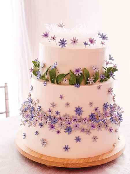 Also, here and there, around every layer you can observe hyacinth flowers which are disposed very neatly and playfully. On the top tier you can observe the same hyacinth flowers details that come to replace the cake topper. The reason for that is obvious: a cake topper would not do the cake any favor, but on the contrary, it will compromise its look.