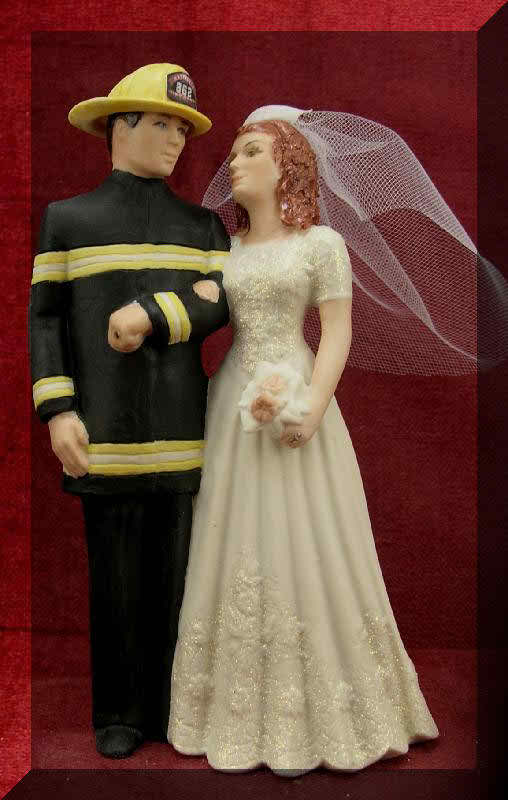 We continue with some other wedding cake toppers that take the similar military motif. This time, there’s a couple formed of a bride dressed as a normal woman that gets married and the groom is wearing a fireman suit. Indeed, there’s a really interesting image created and also let’s mention the fact that you can apply for this kind of topper if that’s the job you have: if you really want to show it, you can do it through the cake toppers.