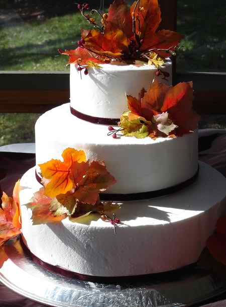 We’ve got another suggestion for you and it’s the second one in this topic. We’re speaking about a three layered cake that is made from round layers. At the basis of every layer you can observe a round part, a round ribbon that is probably made of sweet ingredients. We recommend this cake for a wedding with autumn theme, because it has all the right details involved in it. It’s nice looking and we’re sure that you like all the leaves made of sweet ingredients and that coordinate perfectly with the white cake that looks as if it’s made of stone.