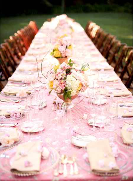 Another decoration tip that we want to share with you and that concerns garden wedding decoration elements is definitely this example…. So, we’re speaking about a table that has on it a beautiful pink table cover and transparent table ware.