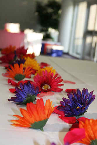 Another idea is to take curl papers, some scissors and a small bouquet of flowers! Take only one flower and place it into the curl paper, but do this after you`ve cut their strains really small! You can attach to these little improvised vases a card with your names on it and you`re done! It looks simply enchanting and it`s less expensive than the idea above!