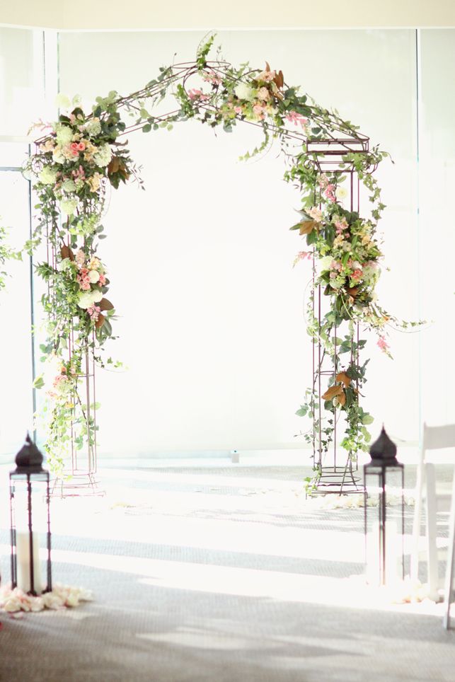 Use a simple, dark arch that rises to a dramatic point; leave the lines clean and unadorned. Hang an enormous floral kissing ball in pale white or pink from the apex.
