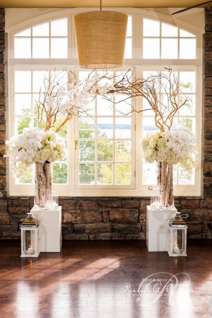 And if that’s still not enough, decorate with three-point florals, and add a tall arrangement — think bare branches, bittersweet or topiaries — to the base on each side.