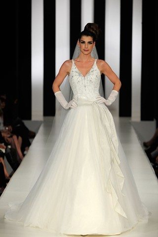 Here’s how we continue with suggesting another example of designer wedding dress and we’re certain that this one is going to seem interesting to you as well. So, we’re speaking about a dress that has thin straps and a V-neckline. The bodice has nice looking embroidery on and let’s mention that the skirt is made in semi transparent fabric from multiple layers. On one side of it, you can observe a bow detail that is created from a piece of long ribbon. Attached to this dress is a pair of medium sized gloves made semi transparent fabric. The veil of this dress is also great looking and it’s made of semi transparent fabric and it’s long in the same time.