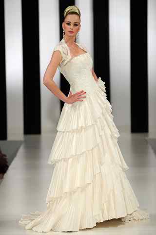 So, there’s the first example of designer wedding dress that is conceived in a gorgeous manner. This one is a long dress with ruffled details on it. It has a straight neckline and it has nice looking details on the bodice. The skirt is made of multiple layers of fabric and with ruffled details. You’re going to see just how great this dress goes on your body and you’re going to feel pretty contempt wearing such a model. Let’s also mention that you can observe a short sleeved bolero over this dress and all these elements go really nice together as we can observe it.