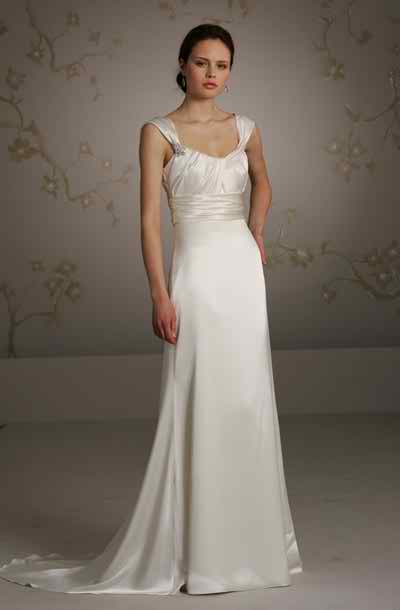 So, we start with a long sleeveless wedding dress that has sweetheart neckline and it’s made of shiny fabric.