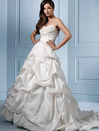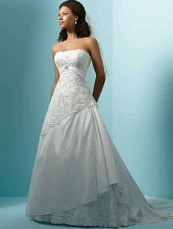 The other Alfred Angelo wedding dress that would be really nice to share with you consists of an A – style wedding dress that has a sweetheart neckline and tiered details on the entire surface of the bodice as well as on the skirt. The skirt, which is designed in A- style has natural tiers in it, which are made of the natural side of the fabric. Another thing that needs to be mentioned relates to the short train, which continues in the back side with a short train.