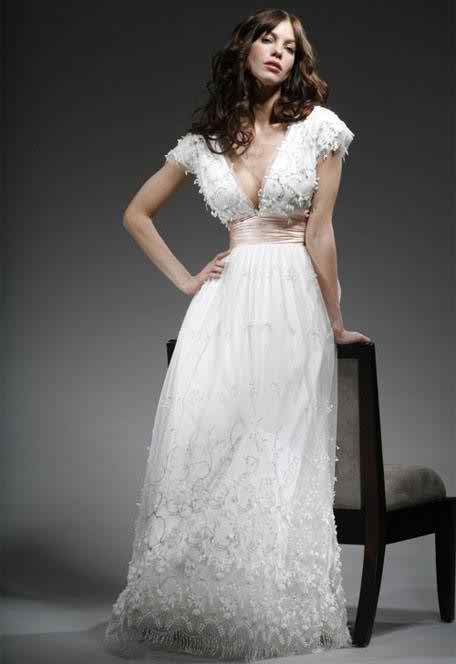 We’re speaking about an A line wedding dress that has a V neckline, which is very deep and short sleeves. Also you can observe embroidered details on the surface of the upper side of the wedding dress and on the skirt as well.