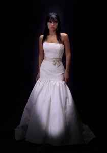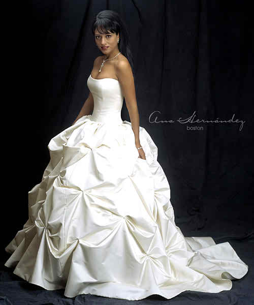 We would like also to mention about another Ana Hernandez wedding dress…. it’s a strapless wedding dress that is realized with a straight neckline and in mermaid style. The body shapes are very well emphasized through the tight bodice and the well delimited waistline with the help of a shiny and golden ribbon, which has a bow detail applied.