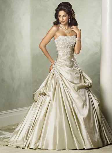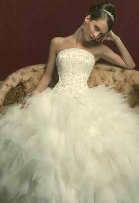 Our next suggestion is a corset dress with a really ruffled skirt. This dress is type ball room and it has a modern touch too. The corset has nice looking embroidery, floral maybe. The skirt is really voluptuous, it’s made of taffeta and it has only threaded and ruffled parts in it. It’s indeed an interesting dress, don’t you think so?
