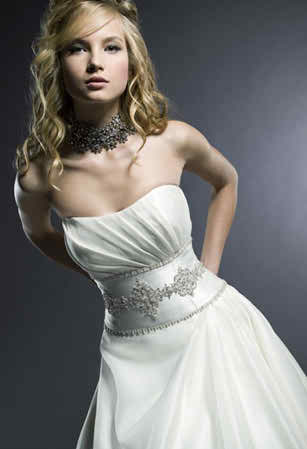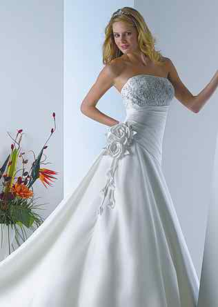 Our last suggestion of corset wedding dress has to be this one: an A style dress with a tight corset and with oblique lines. The dress has a nice looking corset formed of two parts: the embroidered area on the breasts and the oblique lines underneath the breasts.