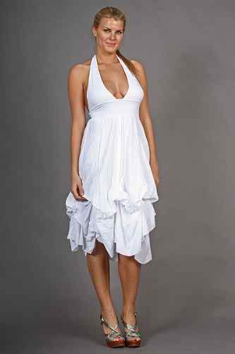We continue with another cotton wedding dress that is of course made of cotton. This dress would be ideal to be worn in this period, more exactly in a spring-summer wedding. You can observe a deep cleavage, the halter straps and the ruffled details in the skirt- on the margins more exactly. Let’s also mention that this dress is short to the knees and it be considered as an informal dress.