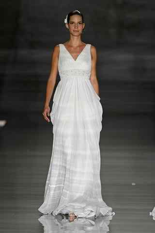 The next suggestion that we would like to make consists of a long wedding dress that is designed in a really gorgeous manner. This one has a V neckline with not so thin straps. You can observe embroidery underneath the breasts and directly from this surface you can observe how the skirt starts and it’s long down to the floor. There are really nice waves created in the same time and the visual effect created is stunning.