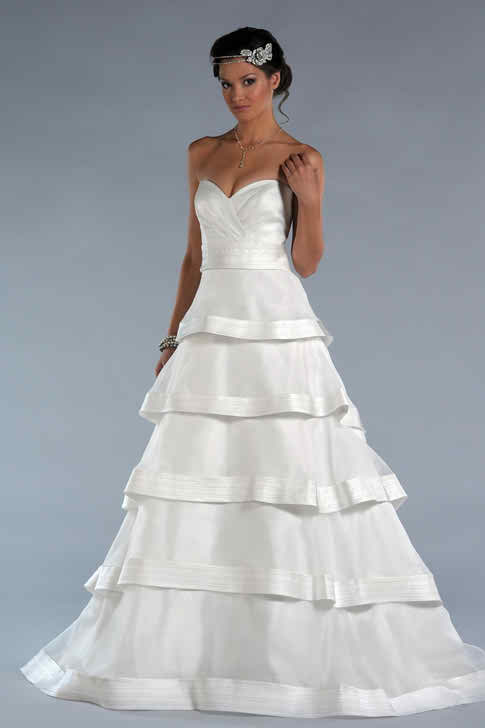 The shape of the bridal gown is also what makes it unique – it’s designed in A line, but the skirt being made in layers and layers is what makes the difference. The bodice is also small made and it’s designed from a small quantity of fabric with shiny portions on the neckline and on the waistline as well. It’s indeed a unique bridal gown and you can also make it look even special with the use of a tiara in the bridal hairstyle.