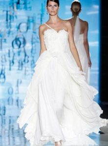 We start with our first suggestion of wedding dress that is designed in a very special manner and you can be certain that you’re going to like it pretty much. We’re speaking about a long wedding dress with spaghetti straps and sweetheart neckline.