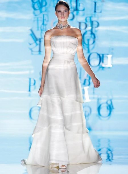Gorgeous isn’t the right word for expressing just how beautiful this dress is: we’re speaking about a long wedding dress, which is sleeveless and it has a straight neckline. This one highlights your body shapes in a gorgeous manner. You can observe some stripe details on the bodice and a waist line with bow details underneath the breasts. As for the skirt, it’s long and designed in A-style from multiple layers of fabric with wavy details on the margins.