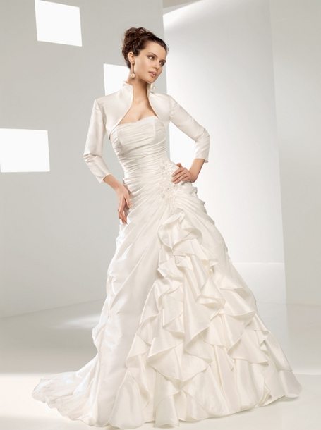So, you can observe tiered details on the surface of the bodice as well as on the areas around the thighs. In one side of the wedding dress you can observe ruffled details and they’re done in waves and waves and in the same time they’re blended perfectly together as to create a really gorgeous visual impression. This sleeveless wedding dress with straight neckline is worn with a bolero with long sleeves and made of the same type of fabric and in the same color. Indeed, gorgeous if you ask us!