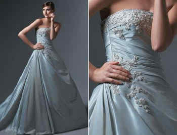 Want to look elegant and different in the same time in your wedding day? Here’s where colored wedding dresses intervene. We’re speaking about a strapless wedding dress that is made accordingly to ball gowns models. This particular wedding dress is made with a straight neckline and it’s tight on the bodice. The skirt is made in A – style, it’s wide and it continues in the back side with a short train. You can observe numerous embroidered details on the surface of the bust as well as on the bodice…. The numerous tiers will create an interesting visual effect in combination with the other details!
