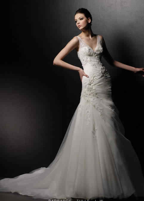Here’s another Enzoani wedding dress that is certainly made to take your breath away, not only through the embroidery used, but also through the quality of the fabrics used. You’re going to observe the deep cleavage and the thin straps. The upper side is tight on the bodice and it has numerous tiers and embroidered details. As for the skirt, it’s designed in A – style and a long train in the back side. You can observe the multiple layers of semi transparent fabric that compose this wedding dress’ skirt.