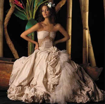 Here’s another suggestion of exotic wedding dress and this is to be worn if you really like it. It’s sleeveless and it has a tight corset with tiered elements on it. The skirt is really ruffled and it has nice looking details on it, being made of two different types of fabric, it has ruffled details on the margins and somewhere in the middle side of the skirt you can observe how the taffeta made part is coming from underneath. The corset is sleeveless and it has nice looking embroidery in a darker tone just underneath the breasts.