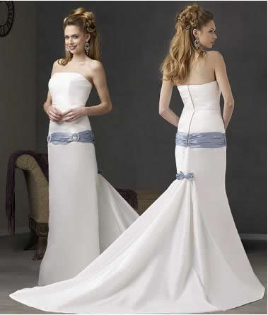 Another amazing Forever Yours wedding dress is this strapless one that is made with straight neckline and it’s designed on the body down to the knees area. This wedding dress continues in the back side with a long train and with a bow detail attached on top of the train. The thighs are surrounded by a purple detail made of ruffled fabric. This is a white matte wedding dress, which we’re sure you’re not going to regret applying for.