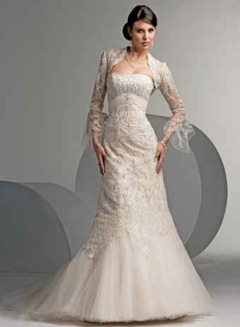 Want a special look? This embroidery wedding dress with the fine bolero seems to be an appropriate suggestion. We’re speaking about a strapless wedding dress that has sweetheart neckline and it’s made in such a style as to make your body shapes look indeed great. Also, it has embroidered details almost entirely and on the bolero you can observe them as well. In the lower side it’s made of multiple layers of fabric and of semi transparent type to be more specific. Let’s add that it’s continued in the back side with a short train and you’re going to look indeed special if you decide to take into account this wedding dress.