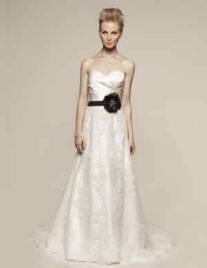 In our presentation of Liz Fields wedding dresses we decided to continue with a sweetheart wedding dress that is designed in A – style and with nice looking details on its surface. There’s the shiny fabric used in the upper side of the corset and around the waistline there’s this black belt that has an oversized detail. The skirt is made in vague A – style and with a short train. As for the flower embroidery used on the surface of the skirt, it seems to make this wedding dress even more gorgeous!