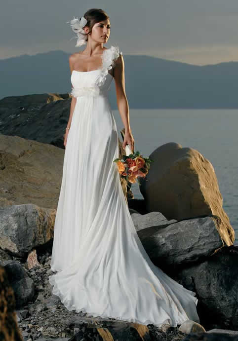 The next Maggie Sottero wedding dress that we want to share with you is in fact a beach wedding dress. This one is designed with one shoulder neckline and in A – style of loosened and thin fabric. This wedding dress has a straight neckline, which is going to emphasize pretty much the bust area. As for the waistline, it’s very well delimited through the usage of ruffled details, flower details. The skirt is made of multiple thin layers of fabric, which cope together into realizing a really interesting visual effect!