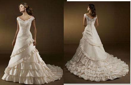 The first wedding dress with which we like to start our presentation is a wedding dress that is designed in A – style with gorgeous details on it. This one has the neckline realized in such a manner as to uncover the shoulder in a very sexy and pleasant manner. You can observe different embroidered details on the margins of the neckline as well as on the surface of the bodice. There’s also the skirt, which is realized in A – style and with a long train in the back side. Also, you can observe numerous layers of ruffled fabric, which compose this gorgeous’ wedding dress’ skirt and how you simply seem to get lost in all its details.