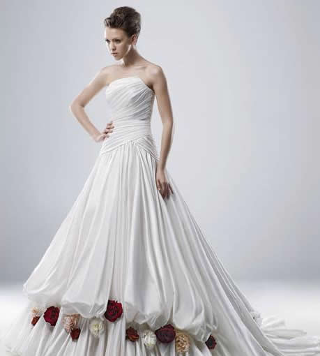 The first model is made of satin with an organza band and a beaded lace overlay skirt that has hand sewn. Also, you can observe taffeta flowers with feathers on the surface of this skirt and in the back side there are also the satin buttons that we need to mention about. You can find this wedding dress in multiple tones and it depends only on you what tone you want to apply for.
