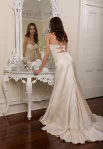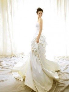 The next suggestion is similar in model with the other dresses, the difference consists in the material it`s made of: silk! It can be found in various nuances: light ivory or dark ivory! The trail is placed at the back of the dress and it`s made of taffeta in pale ivory or white and it`s rather long! The dress describes itself through simplicity and on the corsage you can find nice floral embroideries that can be also found on the taffeta trail.