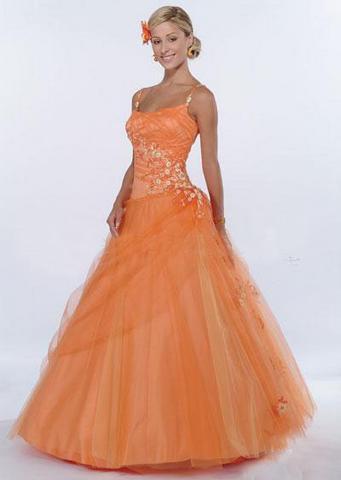 The next orange wedding dress that we want to speak about is made from sating and taffeta. It has the upper side with spaghetti straps and a straight cleavage. Also on the bodice of the corset there is some oblique placed floral embroidery in a similar tone. The ruffled skirt has floral embroidery on it too and the entire gown is orange; it is indeed a nice model and you can apply for it safely if you have a wedding that takes place in the spring time!