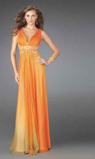 Here’s another orange wedding dress with an open back and it’s definitely ideal to be worn in this warm season. This dress has a V neckline and medium sized straps. Just under the breasts there’s an embroidered area with nice models and motifs and beginning from this waist line are some ruffled straight parts that create the dress’s skirt. Let’s not forget that the back is “naked” and we wouldn’t recommend this kind of a dress for chubby ladies; this is an ideal dress for those who are really slender and thin.
