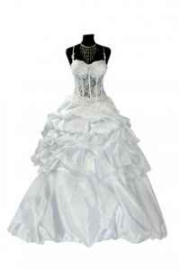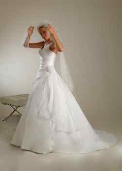 A great dress is that in A shape with a long trail and without sleeves, type corsage plus a nice skirt that seems not to end, this dress is made with tulle over organza and on that tulle there are some fine floral embroideries, the dress simply looks great ! These embroideries are concentrated around the bust area and the ending part of the skirt, on the trail also!
