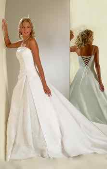 A nice model is similar to the one presented above! It`s an entire dress in the upper area, corsage type with plissés on the breasts, under that area some flowers made put of material that continue with nice embroideries around the wais! The plisses continue in the back side of the dress, exactly on the surface of a corsage! A simple dress, made of silky taffeta and with a long a trail!