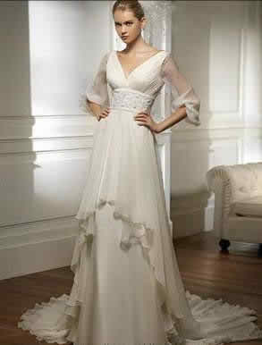 There’s also this A line wedding dress that is made in a very special manner and we’re sure that you’re going to fall in love with from the first instant. So it’s has a V neckline, really deep and as to cover the breasts. The sleeves are short and made of semi transparent fabric and down to the level of the elbows. The waistline is emphasized through the usage of an embroidered area and it’s very well delimited as to create a gorgeous visual impact. The skirt is designed in multiple layers of fabric. The skirt in fine A line and over it, there’s this other layer made of fine and natural tiered fabric, which continues in the back side with a short train!