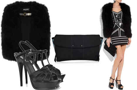To all of these, we add a pair of high heel black sandals that go nice and a black envelope purse and let’s not forget about the fur coat as well.