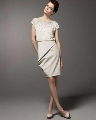 Here’s the other model of summer wedding dress that we want to suggest to you. This one is a ruffled shoulder matelasse dress that we want to present to you. It’s made in ivory tone and it has tonal elements here and there. The one shoulder neckline has a nice framing made of ruffles and the visual effect is definitely impressive. The waist line is really natural, there’s also an asymmetric draping that creates a puffed peplum on the front side of this straight skirt. The dress is short and it makes your body look gorgeous and really thin in the same time.
