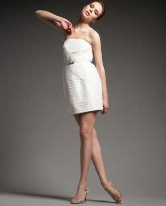 The last example that we have for you consists of a short wedding dress, which is strapless and is made of pleated silk. This dress has the color of white sand and it has horizontal pleats in the front and in the back side of the dress, the neckline is strapless and you can observe a thin belt detail on the waist line that delimits the upper side of the body from the lower one.