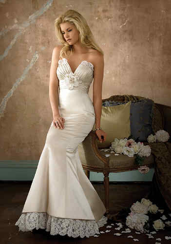 Our next suggestion of such dress is really sexy and it denotes sexuality. The dress is sleeveless and it’s mermaid shape, it has a sweetheart neckline with floral details. Underneath the breasts there’s a line created from a material line and it differences the upper side of the dress with the lower one.