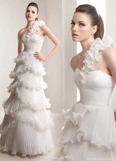 Here’s another special looking White One wedding dress that is created with really interesting details. This wedding dress has sweetheart neckline and it’s designed with a tight corset. Also, you can see the neckline realized from a ruffled area of semi transparent fabric.
