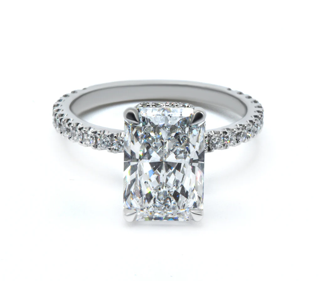 Halo settings amplify the radiance of a radiant-cut diamond by surrounding it with a border of smaller accent diamonds. This setting not only adds extra sparkle but also makes the center stone appear larger, creating a dramatic and luxurious effect.